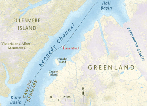 Hans Island is uninhabited, though it is thought to have been part of Inuit hunting grounds since the 14th century. The nearest settlements are Alert, Canada (198km away, pop. 62) and Siorapaluk, Denmark (349km away, pop. 68). It lies, indeed, on the exact line of the border. But, unlike the curious case of Märket rock in the Åland archipelago (divided, to reflect the line, equally between Sweden and Finland), no such plans have been struck on Hans, though it was thought to form part of boundary negotiations in 2012 and 2018. Things were peaceful for years until, in 2005, a diplomatic storm erupted when Canadian Defence Minister Bill Graham visited the island unannounced. Peter Taksø-Jensen, head of the International Law department at Denmark’s foreign ministry, said he had complained, and things quietened down. Nowadays, certainly, the only war is one of internet searches, with the competition on as to which country can plaster Google with most messages claiming Hans as their territory. And it’s not for me to say who’s winning!